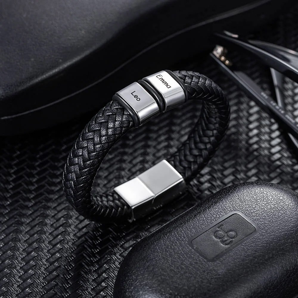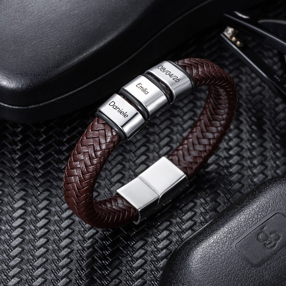 Regola facilmente il bracciale alla misura che preferisci grazie alla chiusura scorrevole. Puoi incidere 1-8 nomi sugli anelli, rendendo ogni bracciale davvero unico e personale. Più lo indossi, più la pelle diventa liscia e lucida, aggiungendo carattere e fascino all'accessorio.